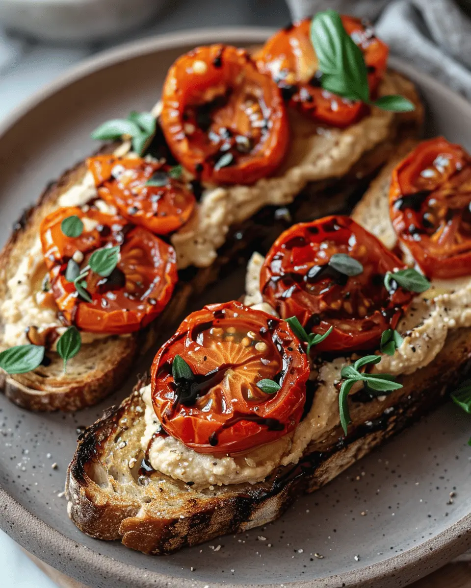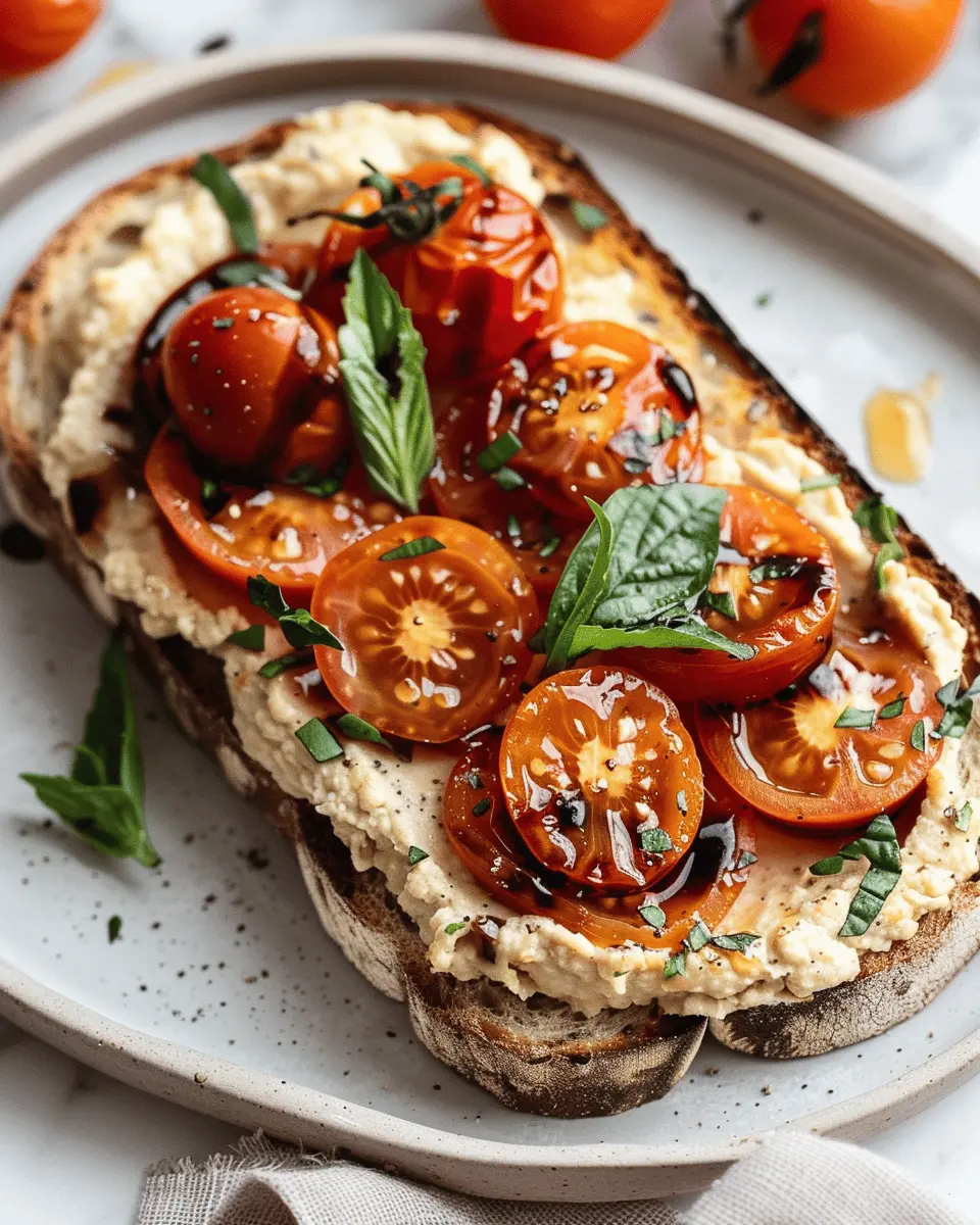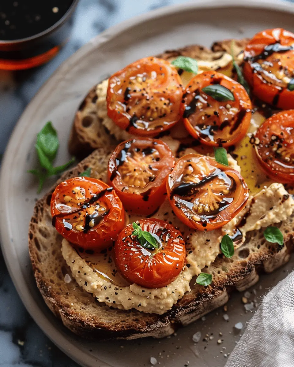 To make your balsamic roasted tomatoes and hummus toast visually appealing, think layers! Start by spreading a generous layer of creamy hummus on your toasted bread, then top it with the vibrant roasted tomatoes. Sprinkle some fresh herbs, like basil or parsley, and finish with a light drizzle of balsamic glaze for that gourmet touch. You could also add grilled vegetables or avocado slices for a splash of color. For the perfect Instagram shot, use a slightly rustic plate and natural light to emphasize the mouthwatering details of your dish!