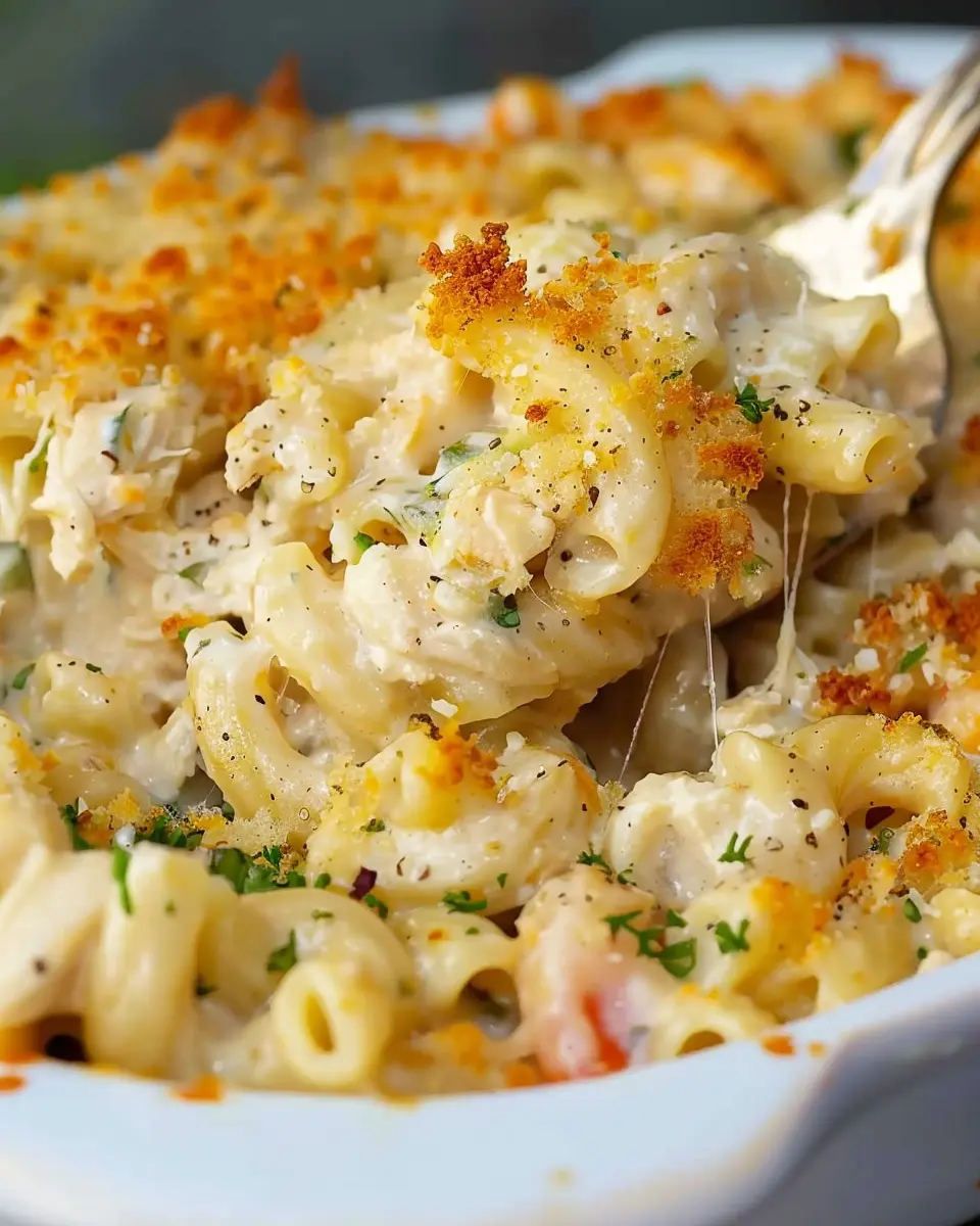 A deliciously creamy chicken pasta casserole featuring turkey bacon that the whole family will love.